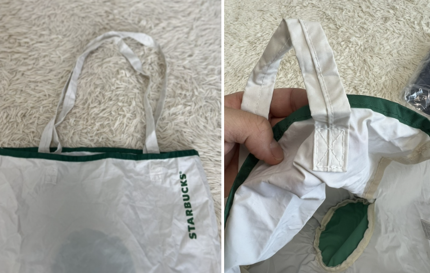 스타벅스 사이렌 리사이클드 쇼퍼백, 폴더블 가방 장바구니는 손잡이 끈이 좀 길고 얇은 게 흠입니다.